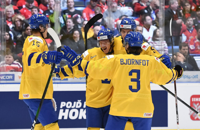 Pirmajā pusfināla pārī (plkst. 16:00 pēc Latvijas laika) mājiniece Zviedrija mēros spēkus ar vienaudžiem no Čehijas. Zviedri ceturtdaļfinālā nedemonstrēja savu labāko sniegumu, vien pagarinājumā ar rezultātu 3:2 uzveicot Šveici, liekot tai finišēt septītajā pozīcījā. Hokeja analītiķi no Zviedrijas gaidīja gan pārliecinošāku sniegumu, gan uzvaru. Čehi tikmēr negaidīti ar tādu pašu rezultātu, bet pamatlaikā atņēma čempiones pilnvaras Kanādai, kas ielaida izšķirošo golu spēles pēdējās sekundēs, satricinot hokeja pasauli. Šī bija viena no retajām reizēm, kad kanādieši ierindojās tik zemā pozīcijā kā piektā vieta.